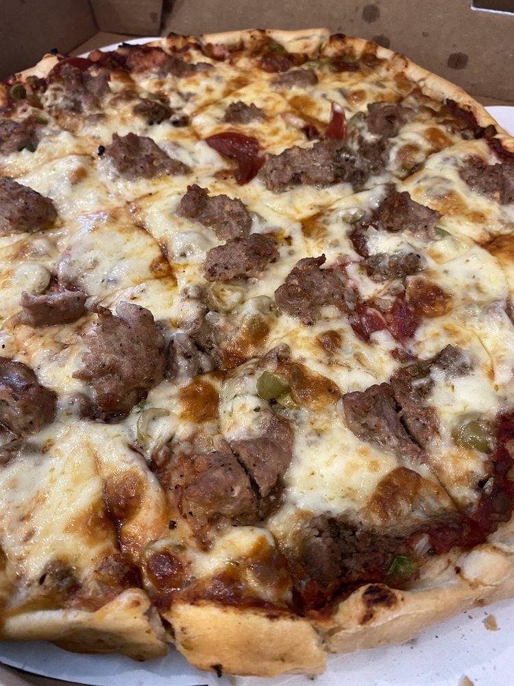 Sausage, Beef, Onion, Pepperoni, Ham, Green Olives, Mushrooms & Green Pepper