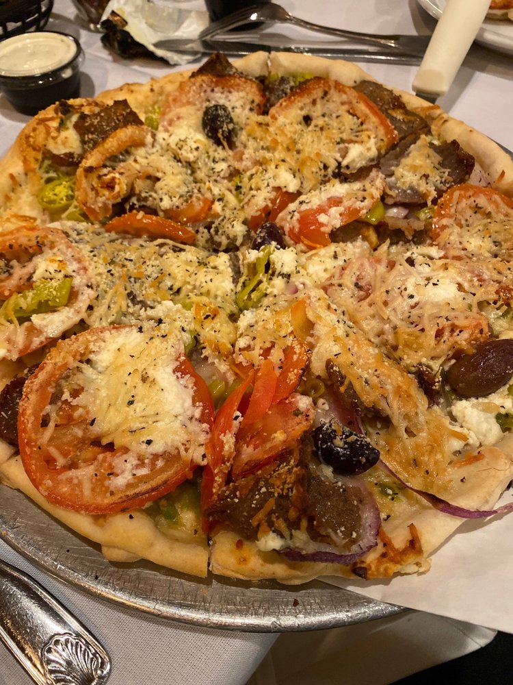 A combination pizza with: gyro meat, kalamata olives, green peppers, red onion, tomatoes, feta, pepperoncini, Romano and olive oil. Seasoned with basil and oregano.