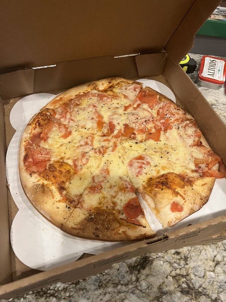 A flattened crust topped with sweet tomato sauce, 100% grated Romano Cheese, 100% Whole Milk Pizza Cheese, Tomato slices, sprinkled with Oregano & Basil on top. To finish the flavor, we sprinkle Kosher salt around the crust for a sweet and salty taste